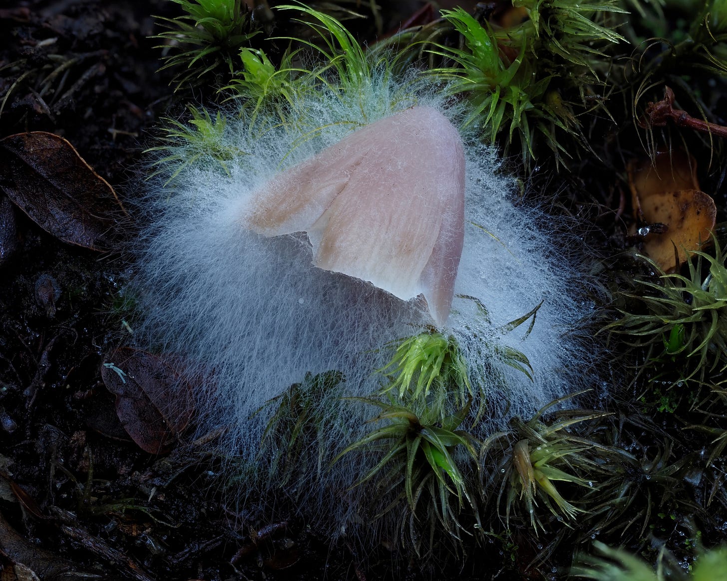 I have seen these Calyptella sp. before growing on moss at Mt. Creighton, so I decided to pull out the ol’ Raynox to try shooting a close-up of these tiny white cups.