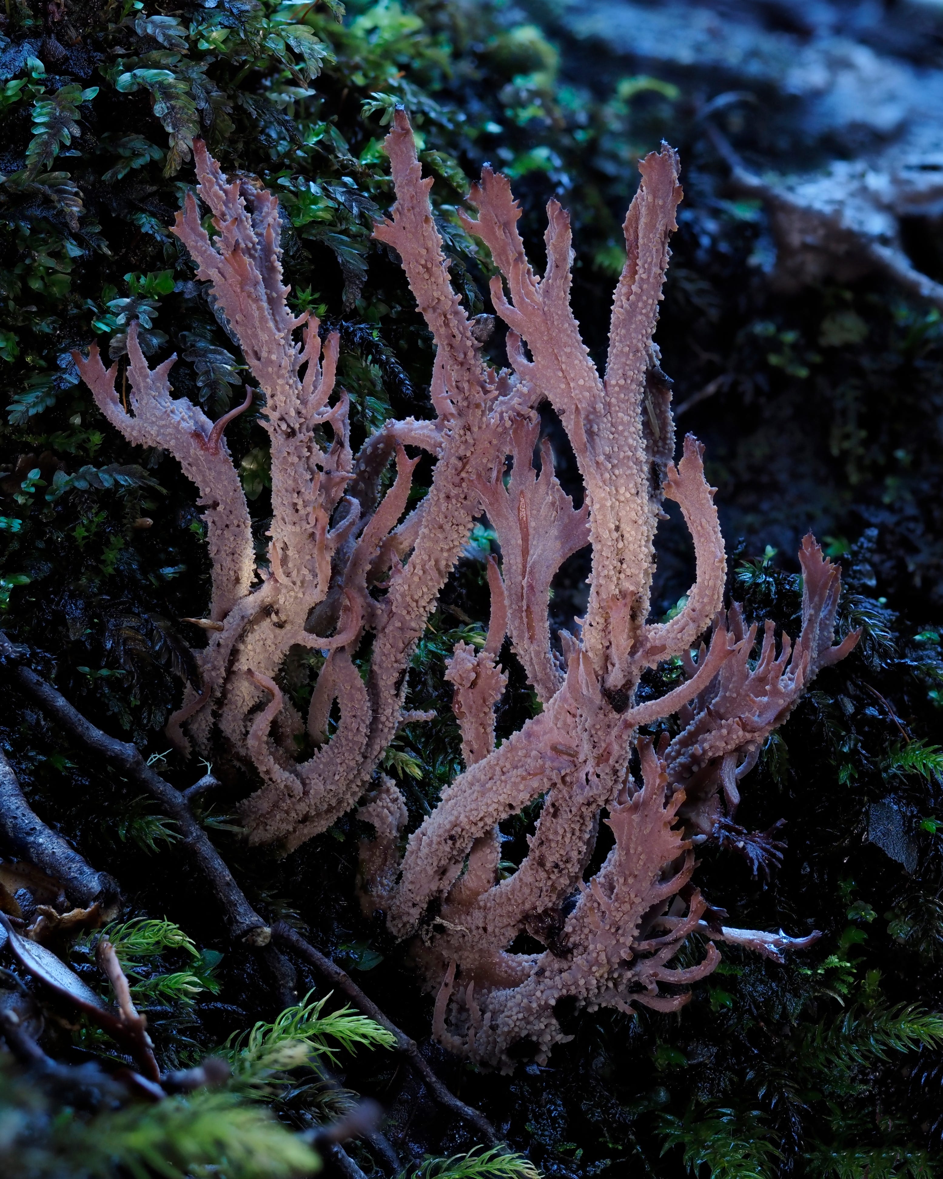 Mauve coral fungi grow from the side of the track. Something about St. Arnaud and the abundance of purple species.